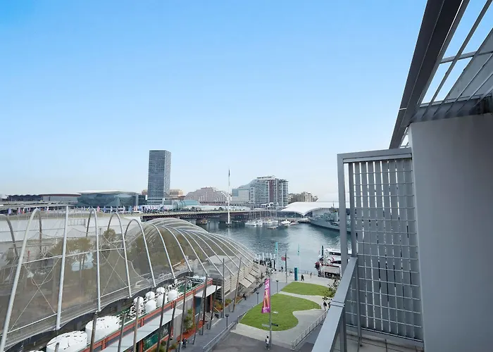 Het Adina Apartment Hotel Sydney, Darling Harbour met 5 sterren is op loopafstand van de winkelstraat in Sydney gesitueerd, binnen 25 minuten wandelafstand van de Sydney Harbour Bridge. Dit aparthotel binnen het bereik van het ANZAC Oorlogsmonument biedt uitzichten op de stad en een een zwembad.